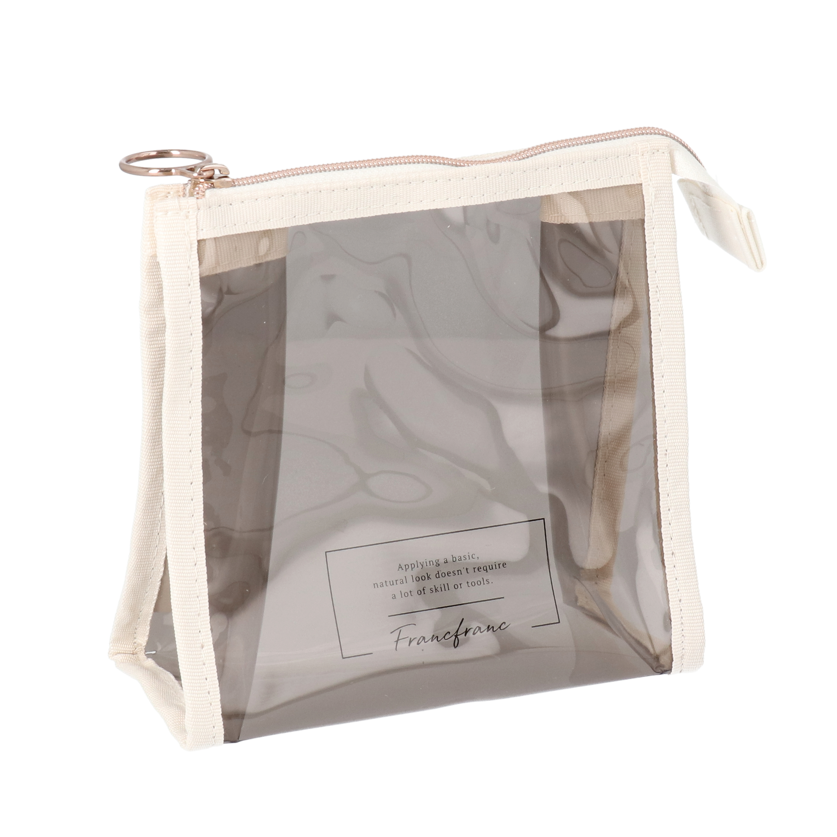 1992年にオープンしたインテリアショップであるFrancfranc(フランフラン)のコスメポーチは、汚れを拭き取りやすいビニール素材が特徴。デザイン性の検証では、約半分のモニターから「透けているデザインが好み」「トレンド感満載だが、ナチュラルな色味で大人でも使いやすい」などの声が集まりました。ただし、人によっては中身が見えてしまうところが気になるかもしれません。ポケットがついていないので小分け収納はできませんが、アイライナーを立てて収納できる点や基本的なコスメアイテムがぴったり収納できるところなど、計算されたサイズ感は魅力的なポイント。取り出しやすいワイドな開け口も好印象です。