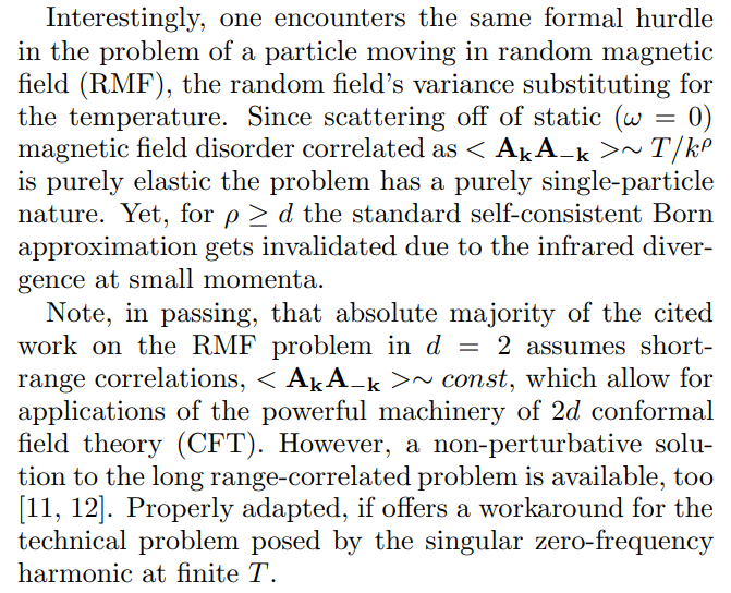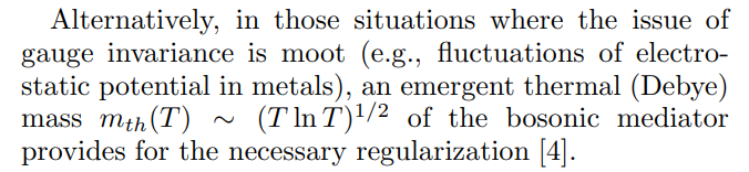 \ Furthermore, a naive generalization of the above calculations to finite temperatures appears to be problematic as (4) picks up a singular contribution Σ(0) [4]. This problem is particularly severe in those situations where gauge invariance prevents the mediating transverse gauge field A⊥ = A × k/k from developing a thermal mass (no magnetostatic screening in normal metals).