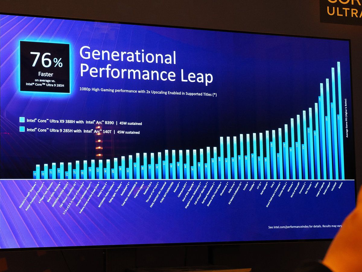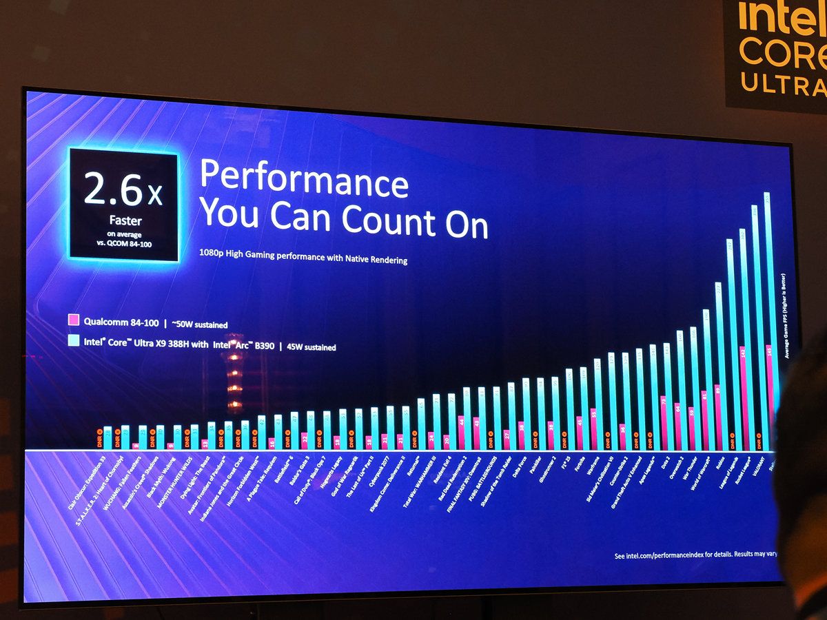 Intel結合全新架構與18A製程的Core Ultra 300系列主打更出色的整體性能與體驗,其中GPU升級至Intel Xe3架構,相較Luna Lake的Xe3架構大幅提升性能,其中Core Ultra X9及Core Ultra X7搭配的12 Xe Core內顯Arc B390更強調有著前一代架構超過60%的遊戲效能提升,Intel在CES特別針對Arc B390的遊戲實際體驗設立專區,並安裝多款熱門3A與電競遊戲供試玩。
