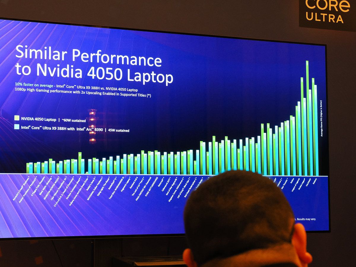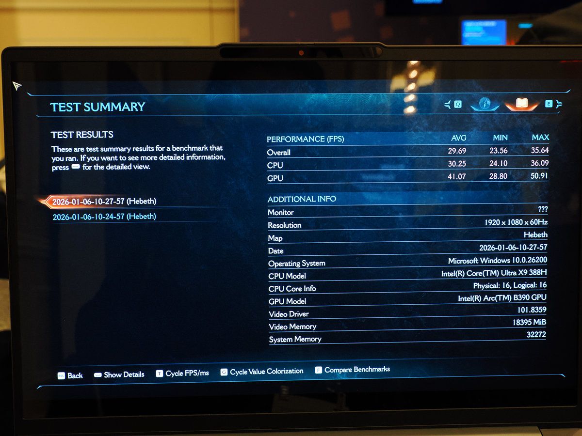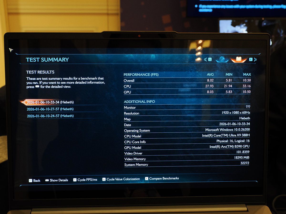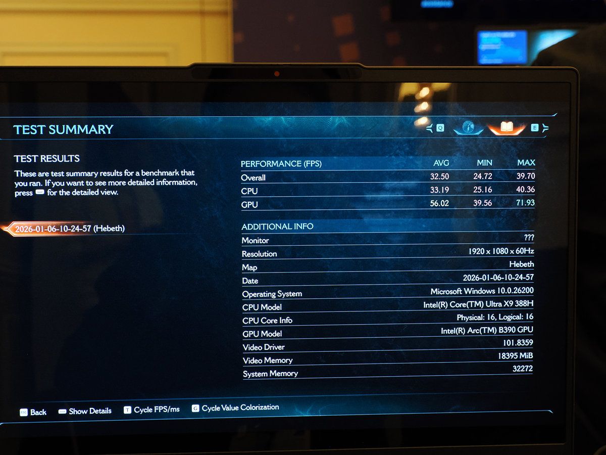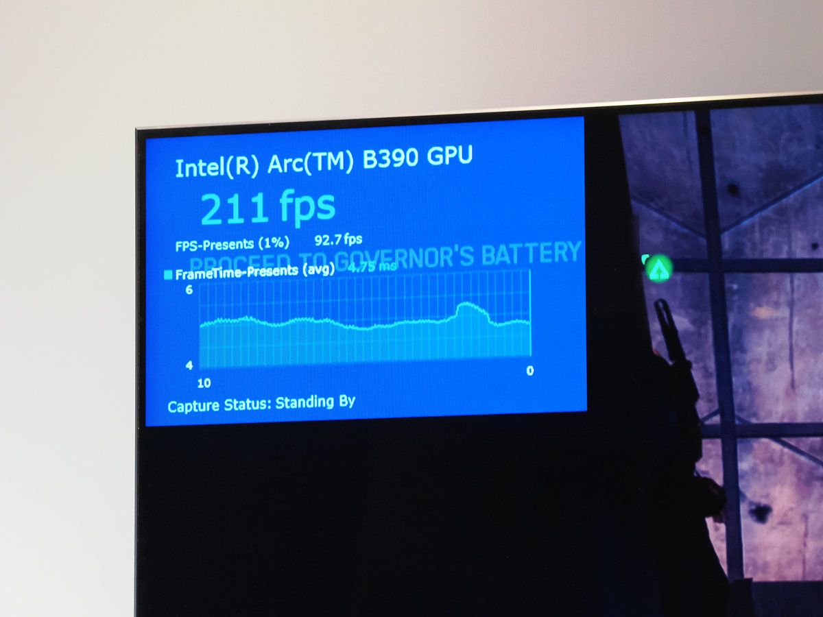 由於Intel Core Ultra 300系列的實機效能測試還未解禁,故現場不能執行性能測試軟體,僅能直接進行遊戲或執行遊戲內建的測試功能,此次是提供遊戲內的性能監控軟體,供在遊玩時可直接觀看遊戲實際的幀率與系統資源使用,畢竟跑分漂亮不一定能反映到實際體驗,Intel更希望在效能測試解禁前可聚焦在真實體驗而非量化的數據,Intel表示Arc B390在遊戲體驗能相當接近NVIDIA GeForce RTX 4050,甚至在特定遊戲有更好的幀率。