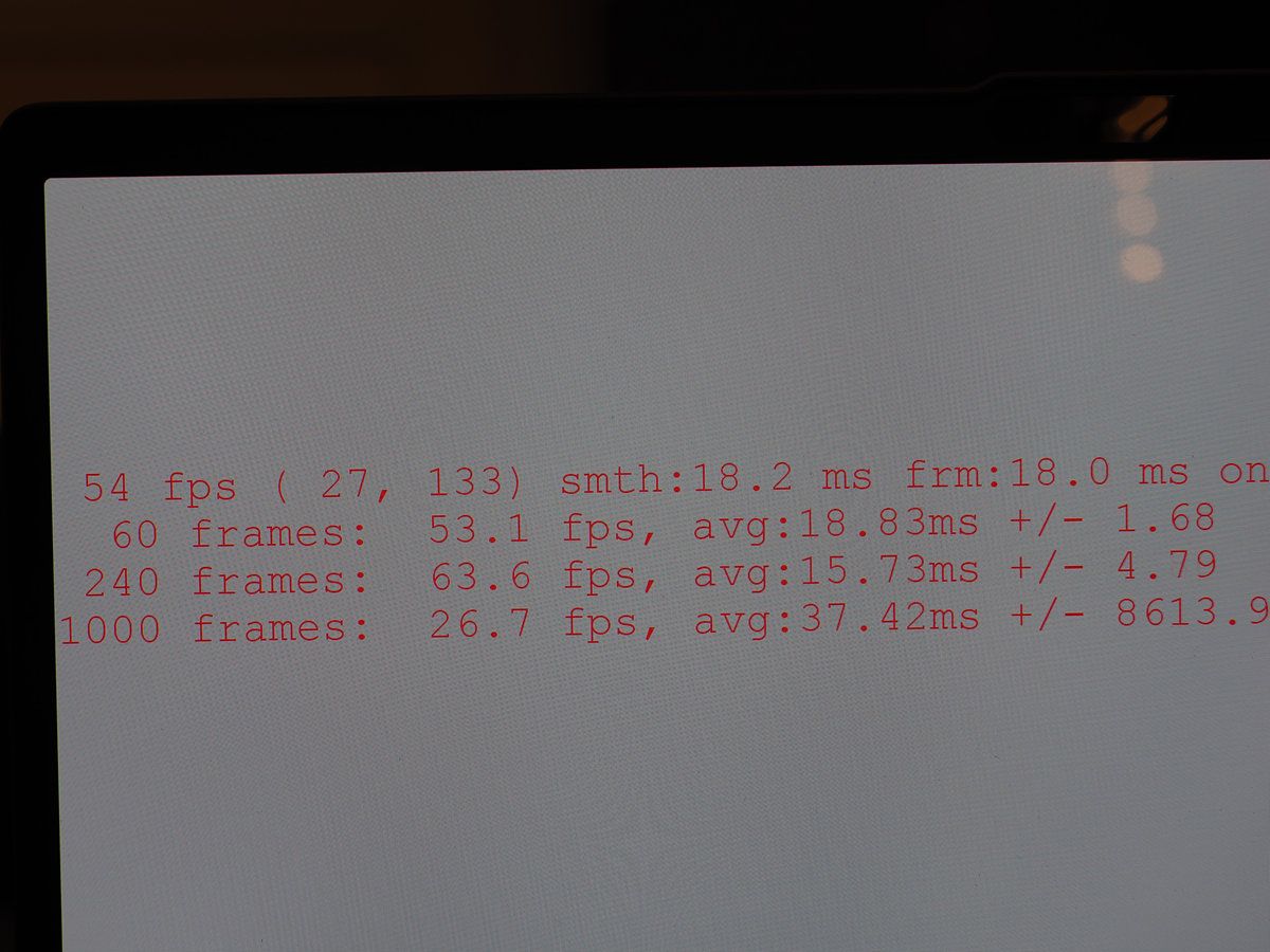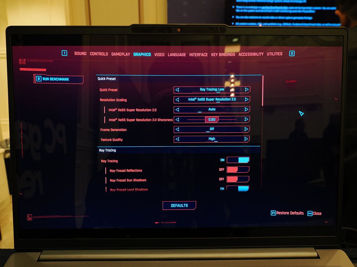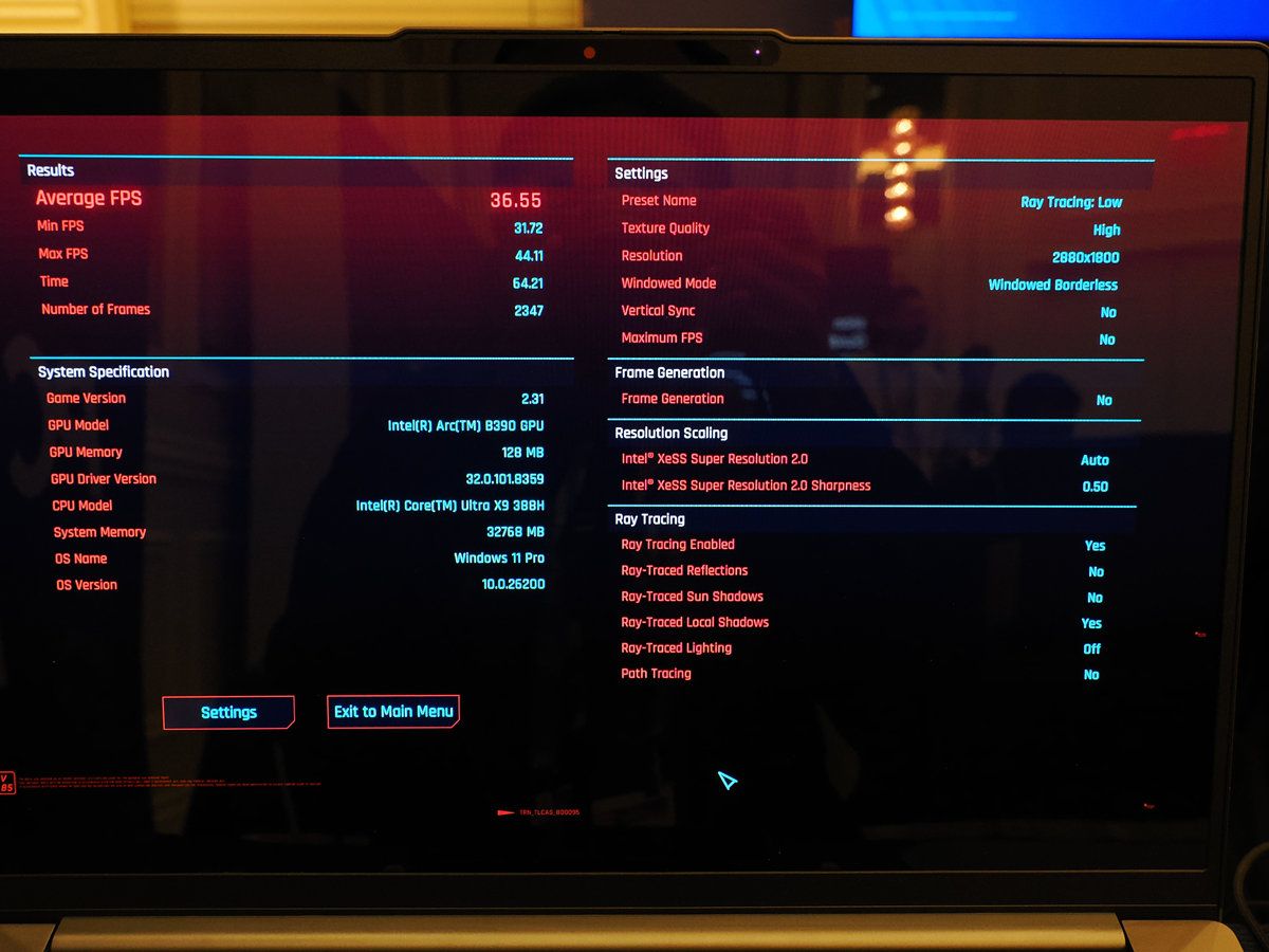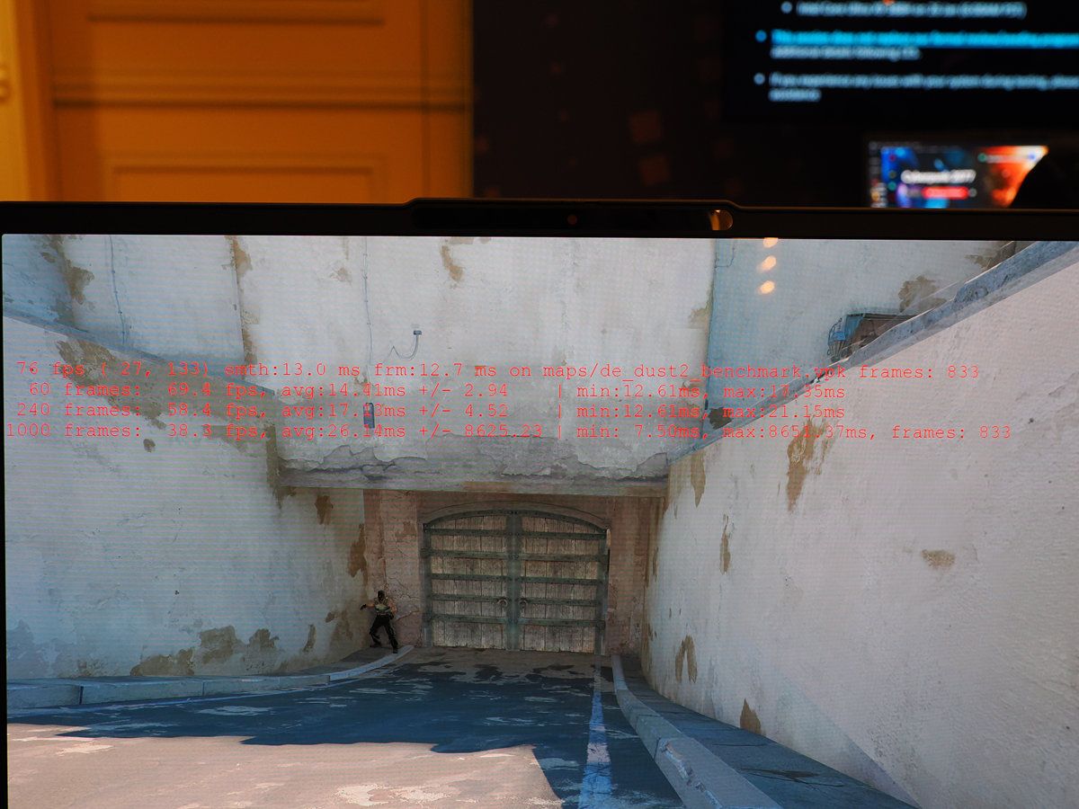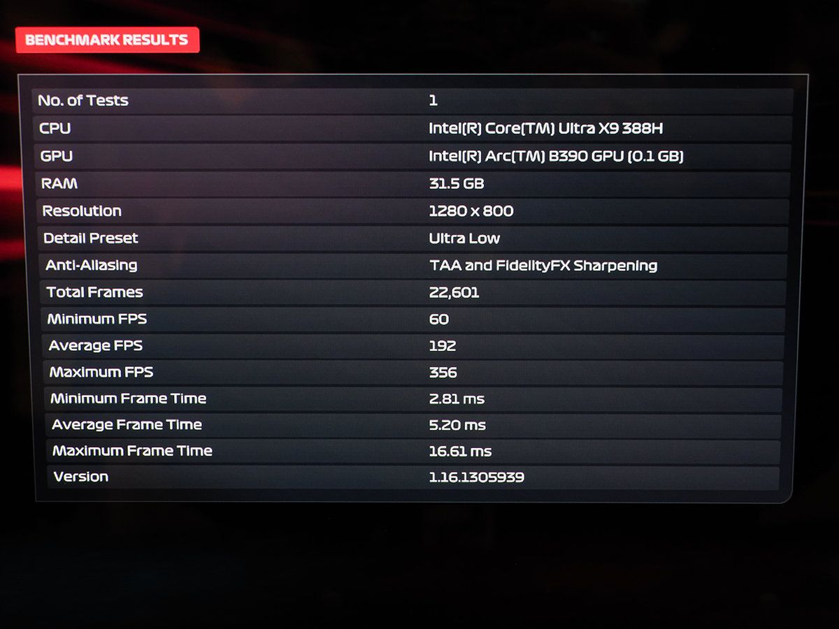 由於Intel Core Ultra 300系列的實機效能測試還未解禁,故現場不能執行性能測試軟體,僅能直接進行遊戲或執行遊戲內建的測試功能,此次是提供遊戲內的性能監控軟體,供在遊玩時可直接觀看遊戲實際的幀率與系統資源使用,畢竟跑分漂亮不一定能反映到實際體驗,Intel更希望在效能測試解禁前可聚焦在真實體驗而非量化的數據,Intel表示Arc B390在遊戲體驗能相當接近NVIDIA GeForce RTX 4050,甚至在特定遊戲有更好的幀率。