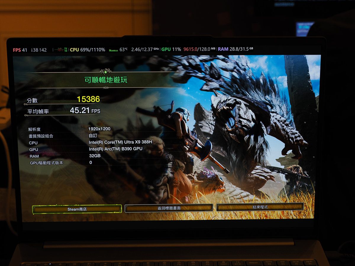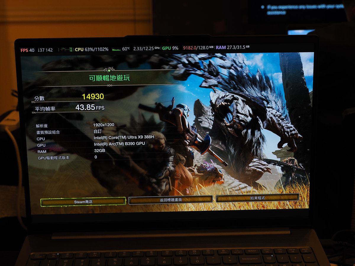 現場利用Intel與聯想合作、搭載Core Ultra X9的工程機執行多項遊戲的表現確實相當亮眼,若跟筆者先前曾測試過的Lunar Lake世代Core Ultra 9 285V,在相近的條件下幀率約高出1.5倍左右,同時系統監控的幀率曲線波動也更穩定,比較可惜的是魔物獵人:荒野的測試軟體並未隨遊戲主體更新,但確實較Lunar Lake流暢度提升相當顯著。
