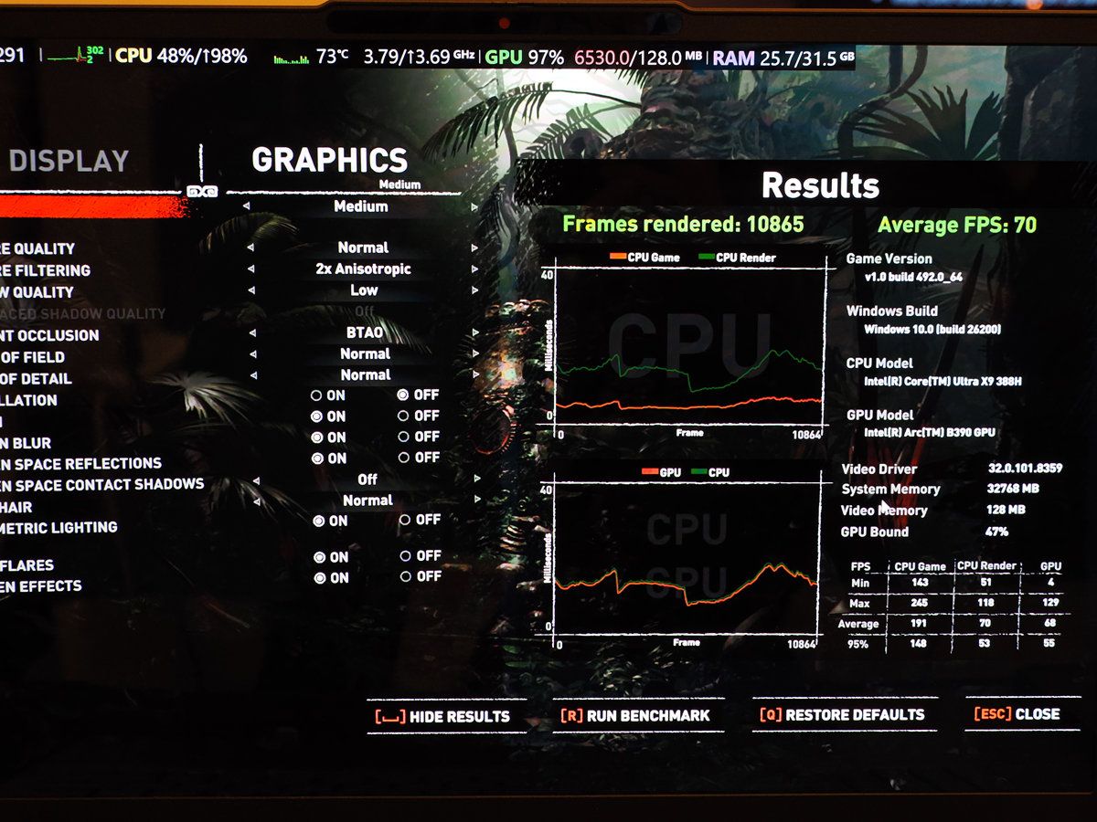 ▲古墓奇兵:暗影中等畫質預設搭配XeSS可達70fps,幀率也大致穩定