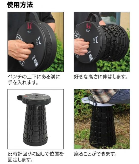 Honda 推出一款限量伸縮摺疊椅,首批 1000 個。椅身採用可伸縮設計,可依需求調整高度。框架使用鋁合金,椅面配置尼龍緩衝材質,坐感較為舒適。椅面直徑 25.5 公分,展開高 45 公分,收納高 7 公分,重量 1.03 公斤,耐重可達 250 公斤。