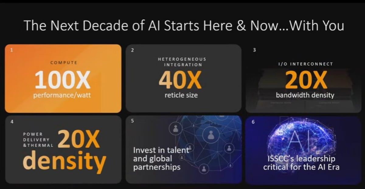▲聯發科預期接下來AI運算的每瓦效能將有100倍成長,在異質整合推動下的半導體光罩尺寸將會加大40倍,而I/O互連頻寬密度也會有20倍成長,同時供電與散熱管理密度也會有20倍成長幅度,另外也會推動更多人才與技術合作,至於ISSCC (國際固態電路會議)也會在AI世代扮演重要角色