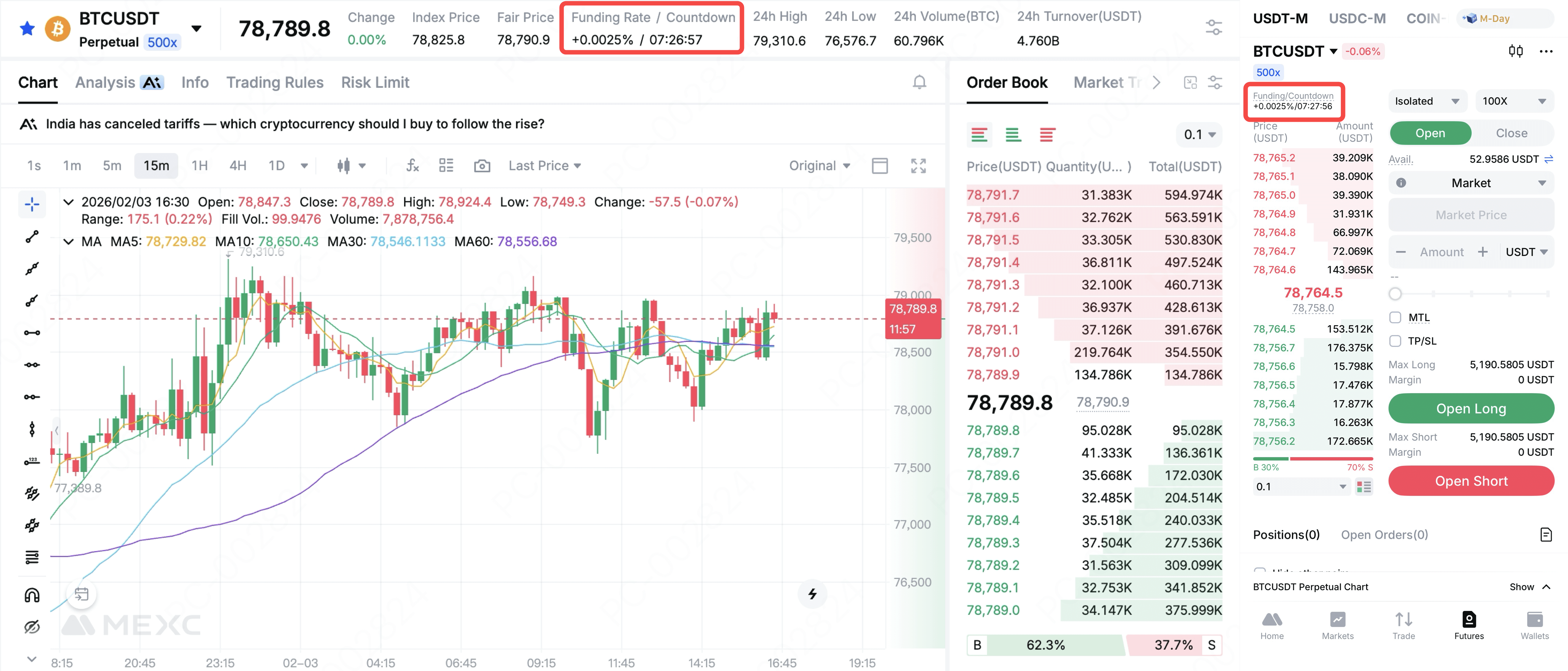 在 MEXC 合約交易頁面,您可以直接檢視當前合約交易對的資金費率及結算倒計時。由於不同代幣合約的資金費率各不相同,您可以透過切換合約交易對來查看所需資訊。